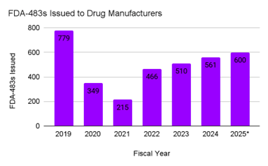 图 1▪▲▷:2019-2025 年(部分数据)FDA 向药品生产设施发出的 483 检查观察报告