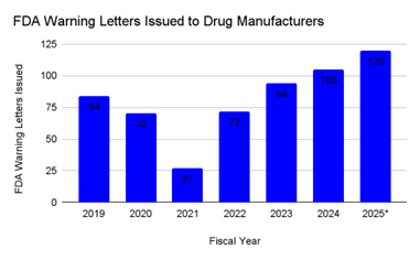 本图统计数据为美国 FDA 针对全球人用药品生产设施(包括为美国市场供货、受 FDA 监管的美国本土及境外生产场地)发出的■▽…、与现行药品生产质量管理规范(cGMP)相关的警告信数量。2025 年数据为基于 FDA 已公示信息的年度部分统计值。
