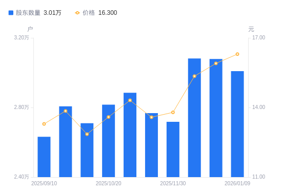 近一年(2025年1月10日至2026年1月9日),江苏神通A股股东户数从2.17万户,增加至3.01万户,增幅38.53%,区间股价上涨29.62%◇○。